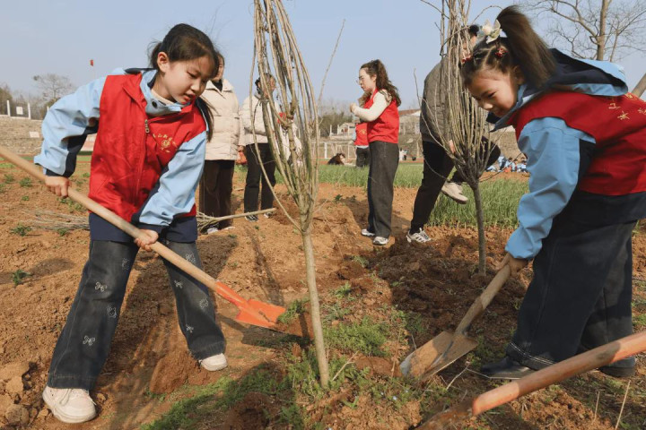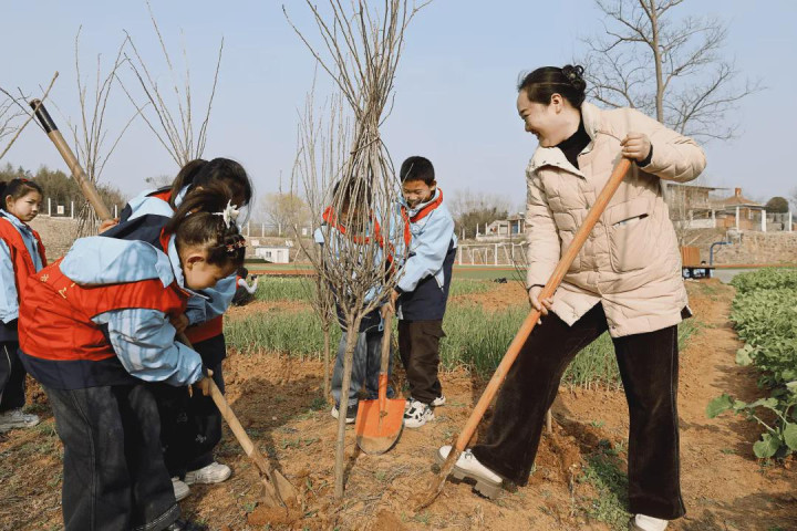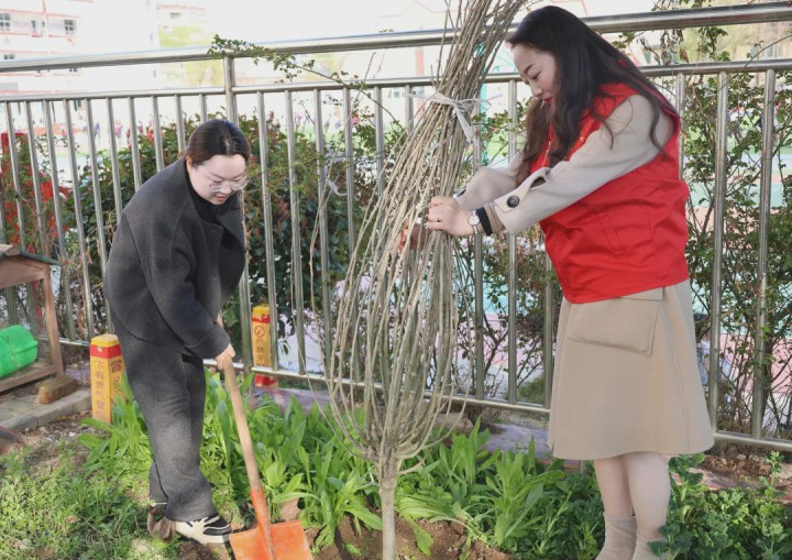 告别北湖,师生们回身回到桐园校园。此时的校园里玉兰绽开、杏花轻舞,一片春光如海。党员教悔们再次挥锹上阵,在花开的地点再种新绿,让新栽的树苗与满园春色并排而立,宛如大手牵着小手,静静期望校园的四季循环,为秀丽校园再添一抹生机与诗意,让绿色成为校园最动东说念主的底色。