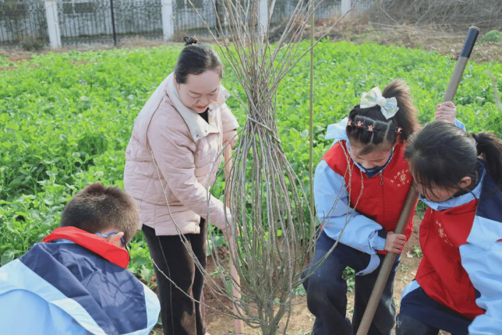 在北湖中心校——桐园做事教悔实施基地,党员教悔充分发扬前锋模范作用,俯身示范植树妙技,掌心覆着孩子们稚嫩的小手,一同挥锹、扶苗、浇水,当作模范而心情。一铲一铲,为小树苗培实但愿的根基;一桶一桶,为春天浇灌成长的梦念念。