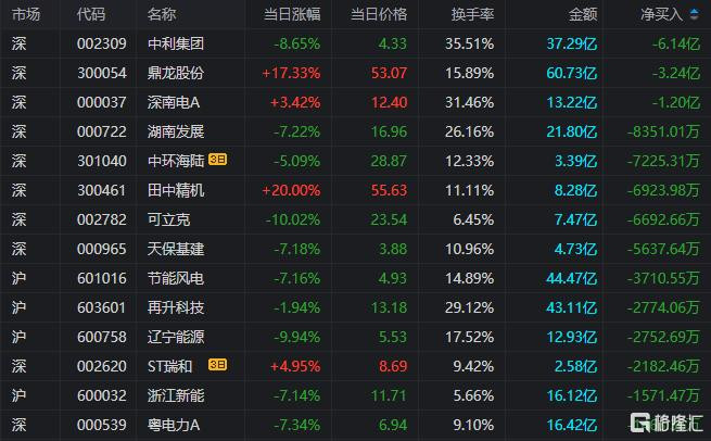 龙虎榜单日净卖出额前三为中利集团、鼎龙股份、深南电A,分离为6.14亿元、3.24亿元、1.20亿元。