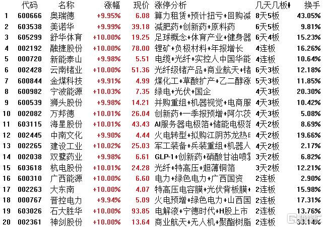 高位股方面,算力租借意见股奥瑞德8天5板;好意思诺华6天5板,舒华体育6天4板,融捷股份、新能泰山均晋级4连板,云南锗业6天3板,金煤科技5天3板,宁波动力、狮头股份等4天3板。