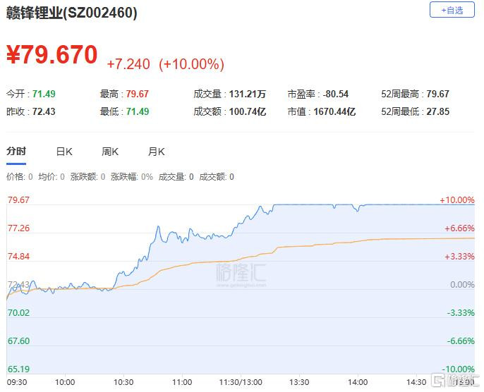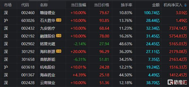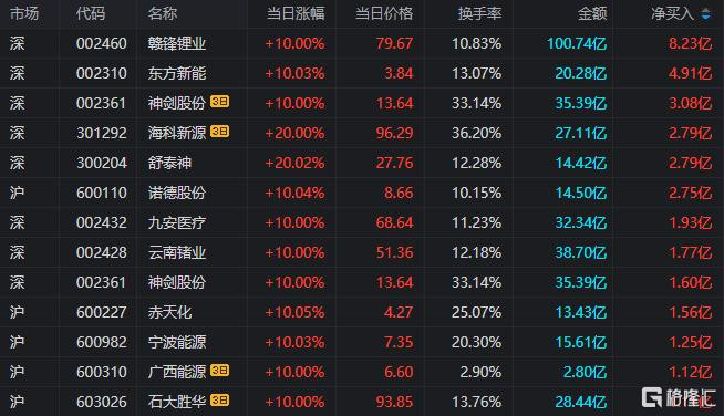 赣锋锂业:当天涨停,全天换手率10.86%,开云成交额100.74亿元,振幅11.44%。机构净买入3.03亿元,深股通净买入7904.91万元,营业部席位整个净买入4.40亿元。
