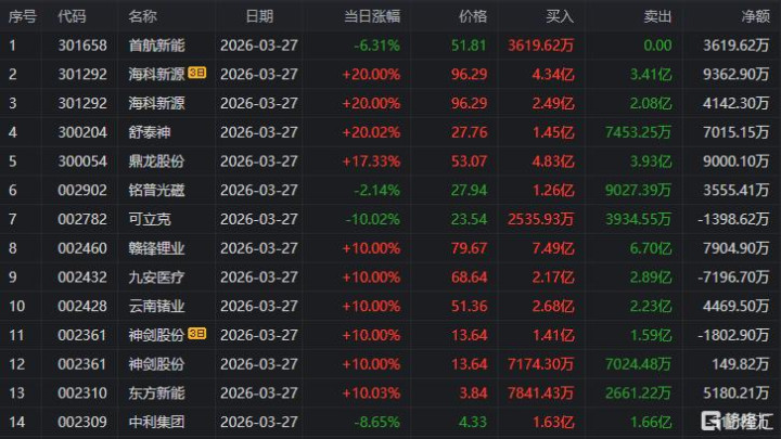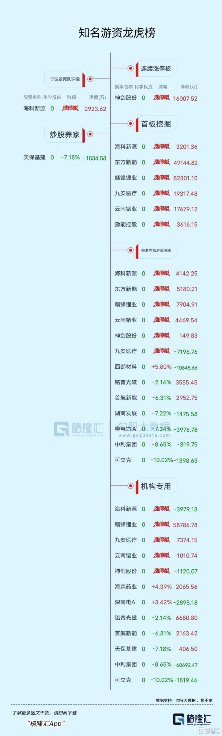 龙虎榜单日净买入额前三为赣锋锂业、东方新能、舒泰神,分离为8.23亿元、4.91亿元、2.79亿元。