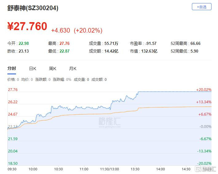 舒泰神:当天涨停,全天换手率12.28%,成交额14.42亿元,振幅21.38%。机构净买入698.54万元,深股通净买入7015.15万元,营业部席位整个净买入2.02亿元。
