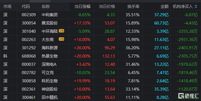 龙虎榜中触及机构专用席位的个股中,当日净卖出额前三为中利集团、鼎龙股份、海科新源,分离为6.07亿元、4.43亿元、2403.91万元。