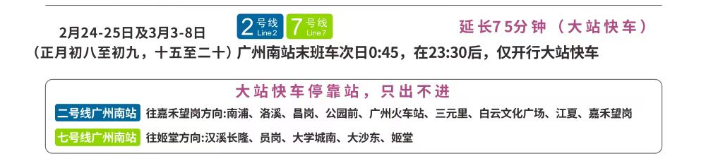 另外,3月3至8日(农历正月十五至二十),二号线及七号线延伸运营75分钟,均为开行大站快车,广州南站末班车时期为次日0:45。需要可贵的是,夜间大站快车半途泊岸站点只出不进,二号线一齐泊岸南浦、洛溪、昌岗、公园前、广州火车站、三元里、白云文化广场、江夏、嘉禾望岗;七号线一齐停汉溪长隆、员岗、大学城南、大沙东、姬堂。