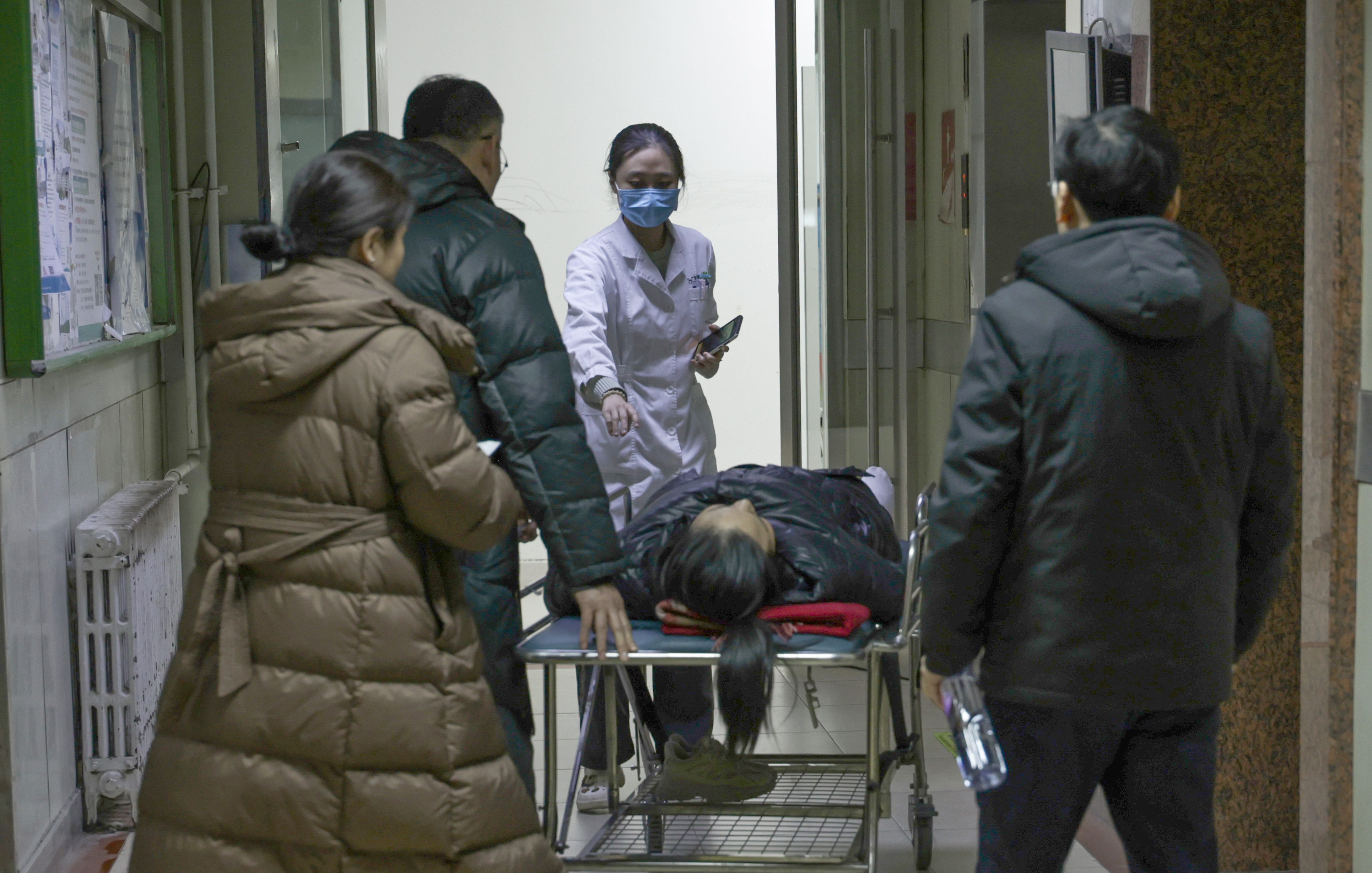2月5日19时许,急诊值班外科大夫指引刚刚收治的患者赶赴病房。
