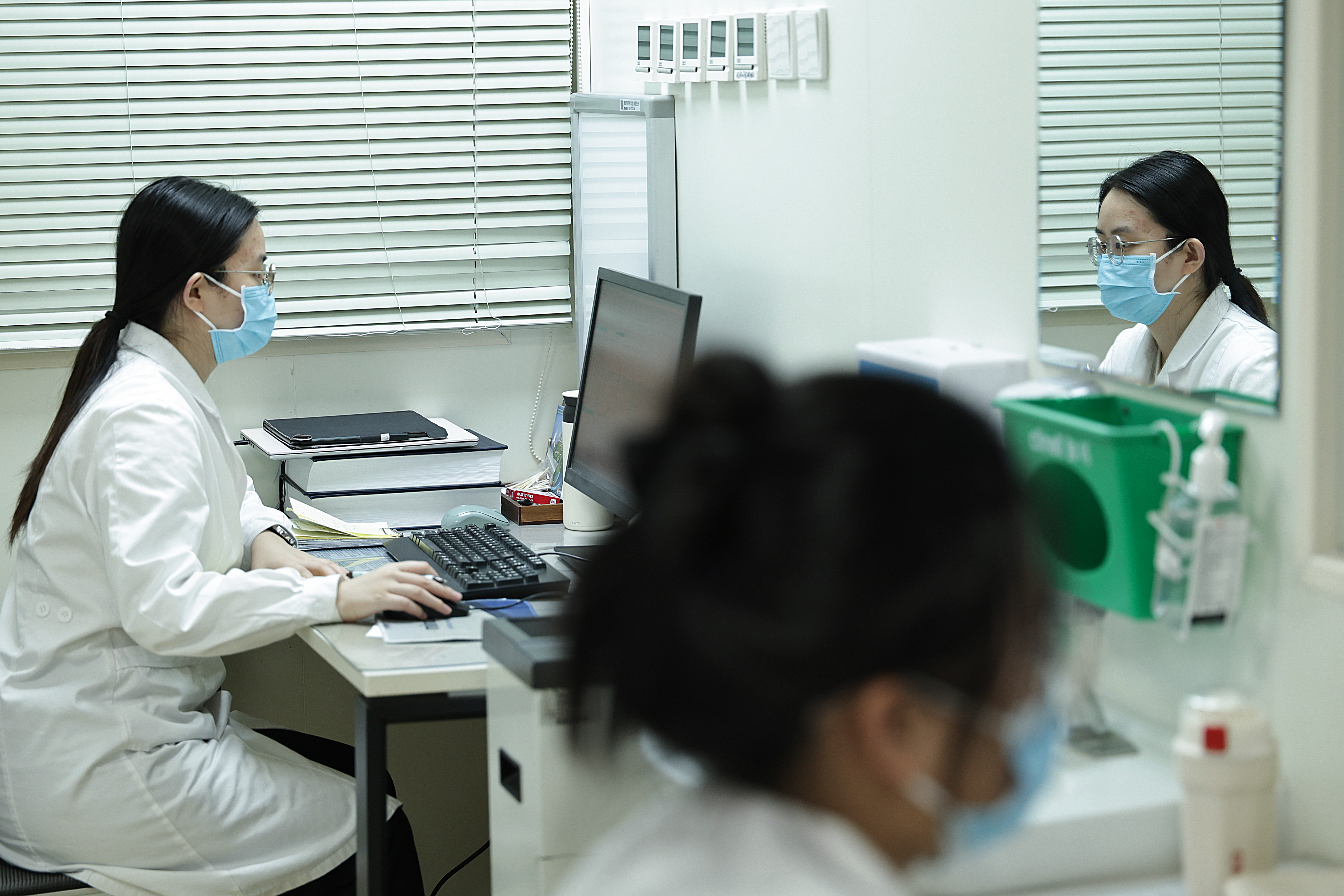 2月9日9时许,急诊科主治医师李琼(右)与学生在办公室进行业务相易。