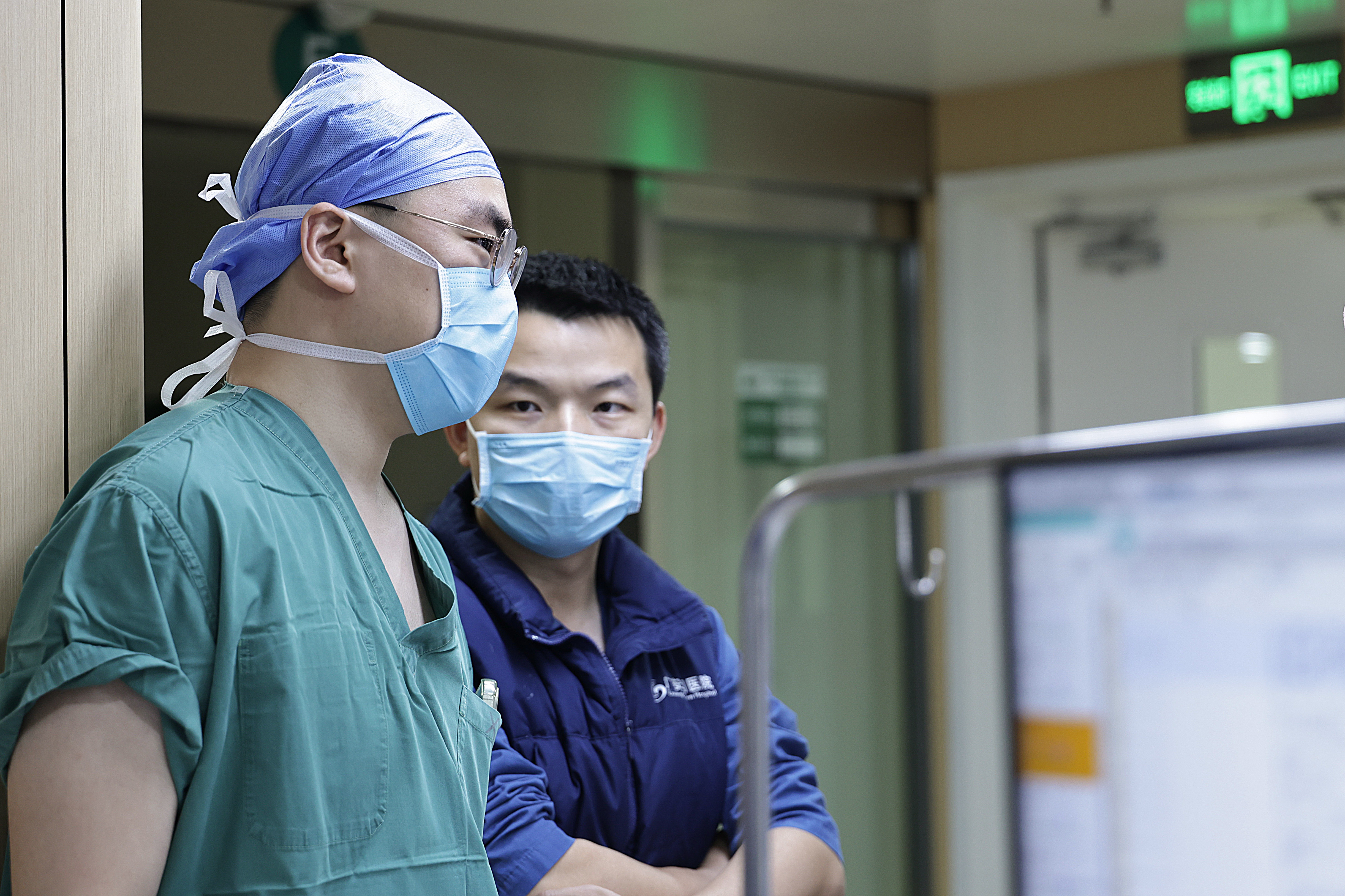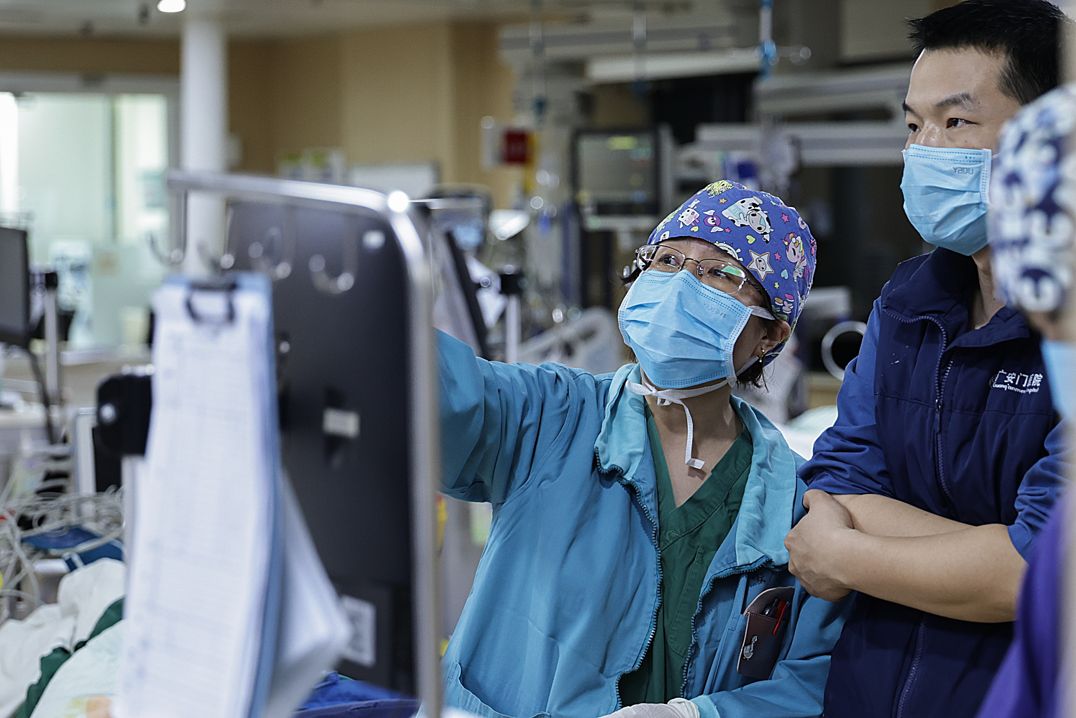 2月4日3时许,别称麻醉大夫(左)和重症监护室大夫嘱托患者病情。