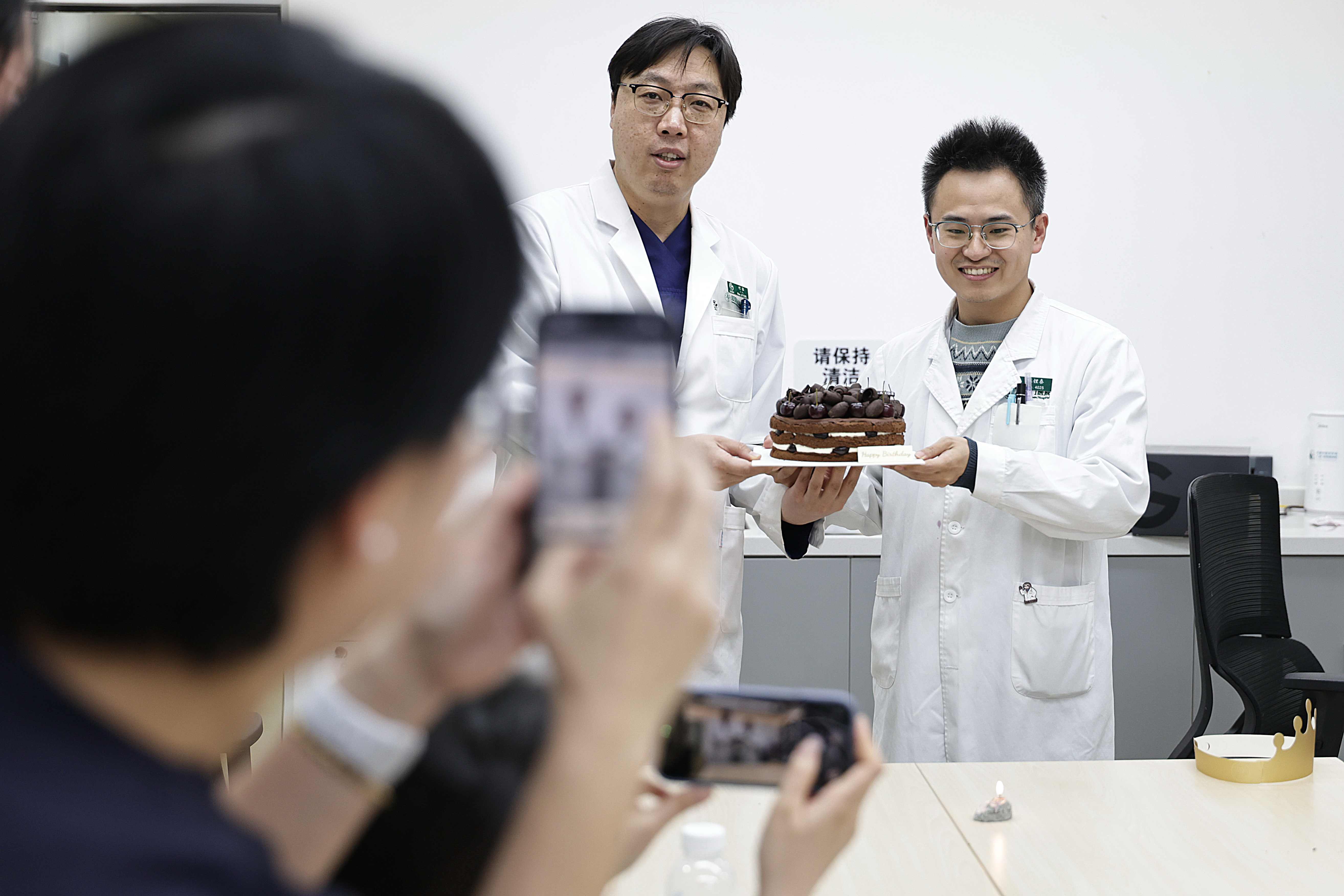 2月5日19时许,两位急诊科大夫在休息室内庆祝诞辰。