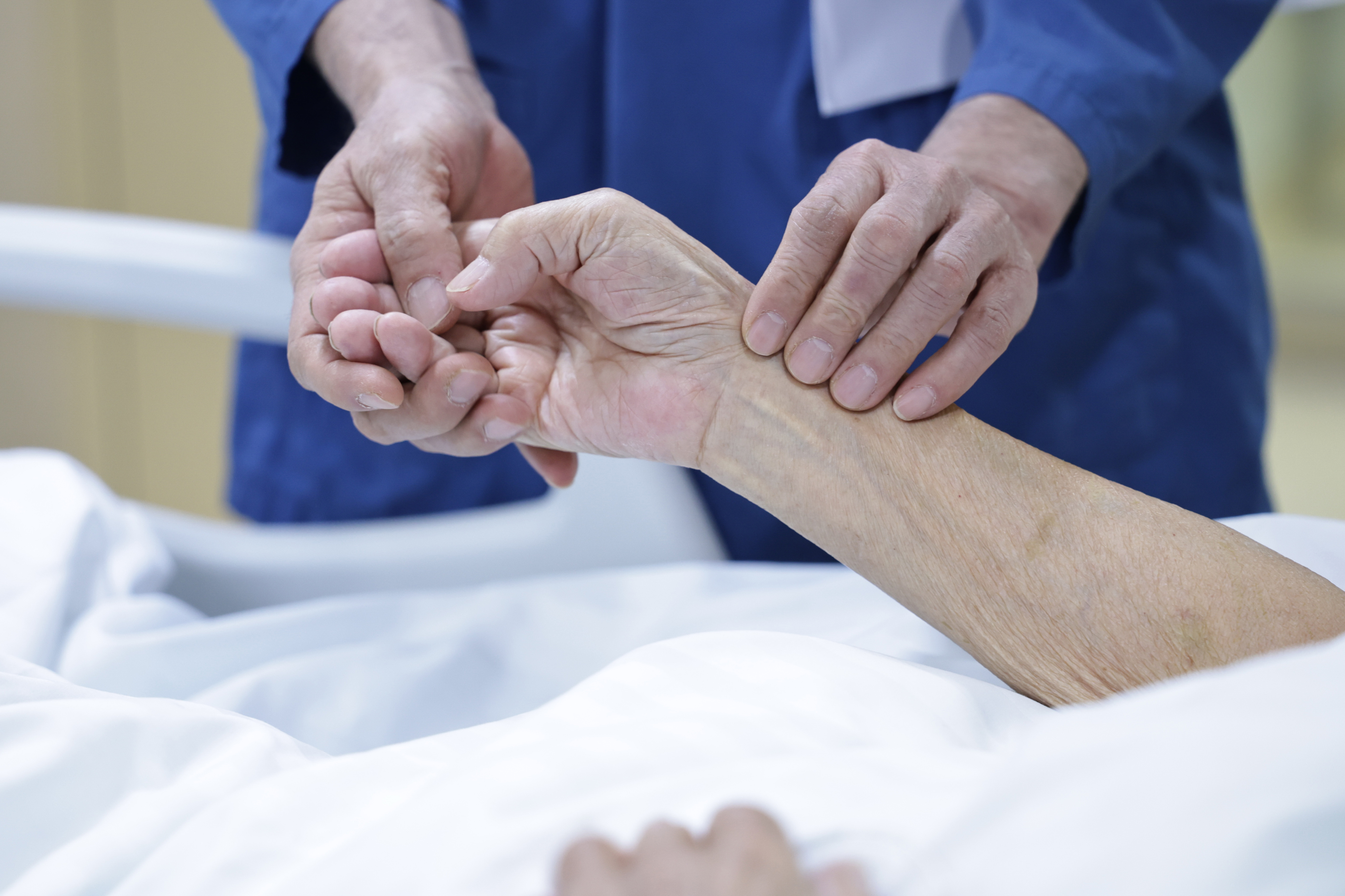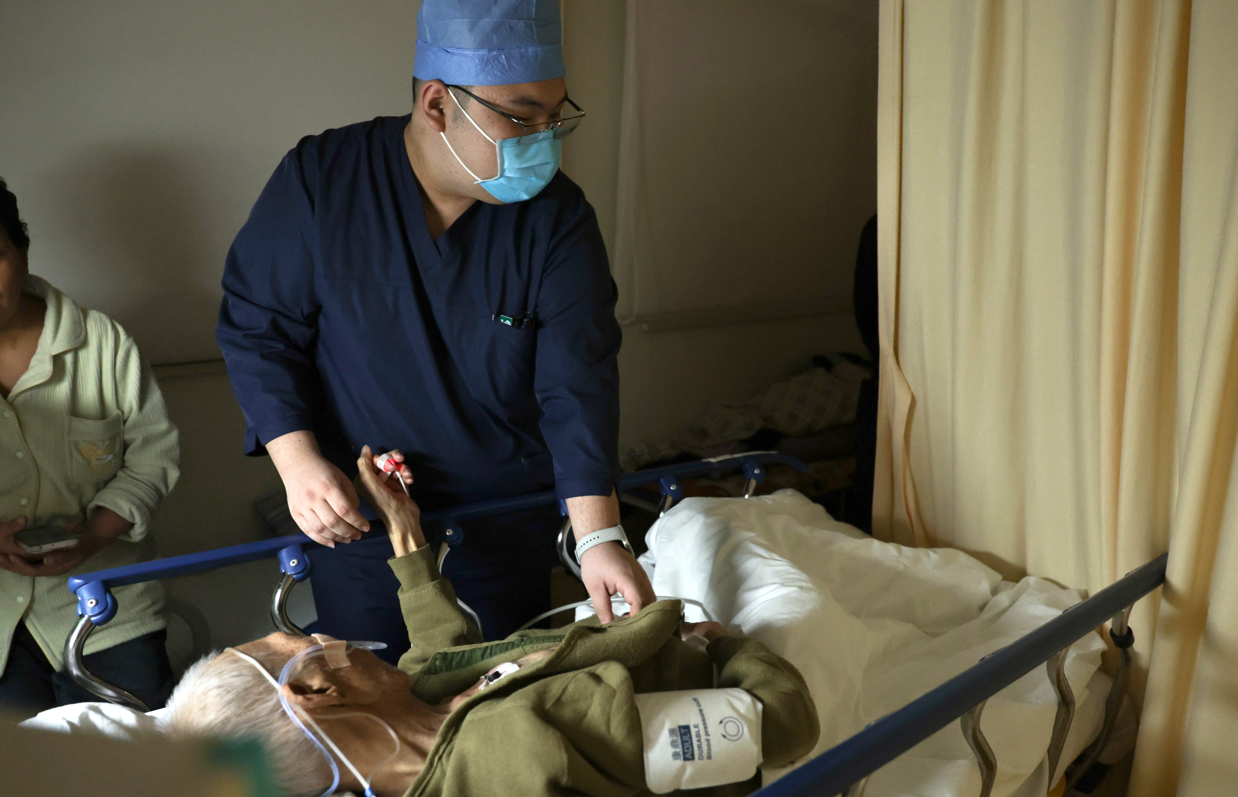 2月9日8时许,急诊科资深主任都文升在重症监护病房为患者号脉。