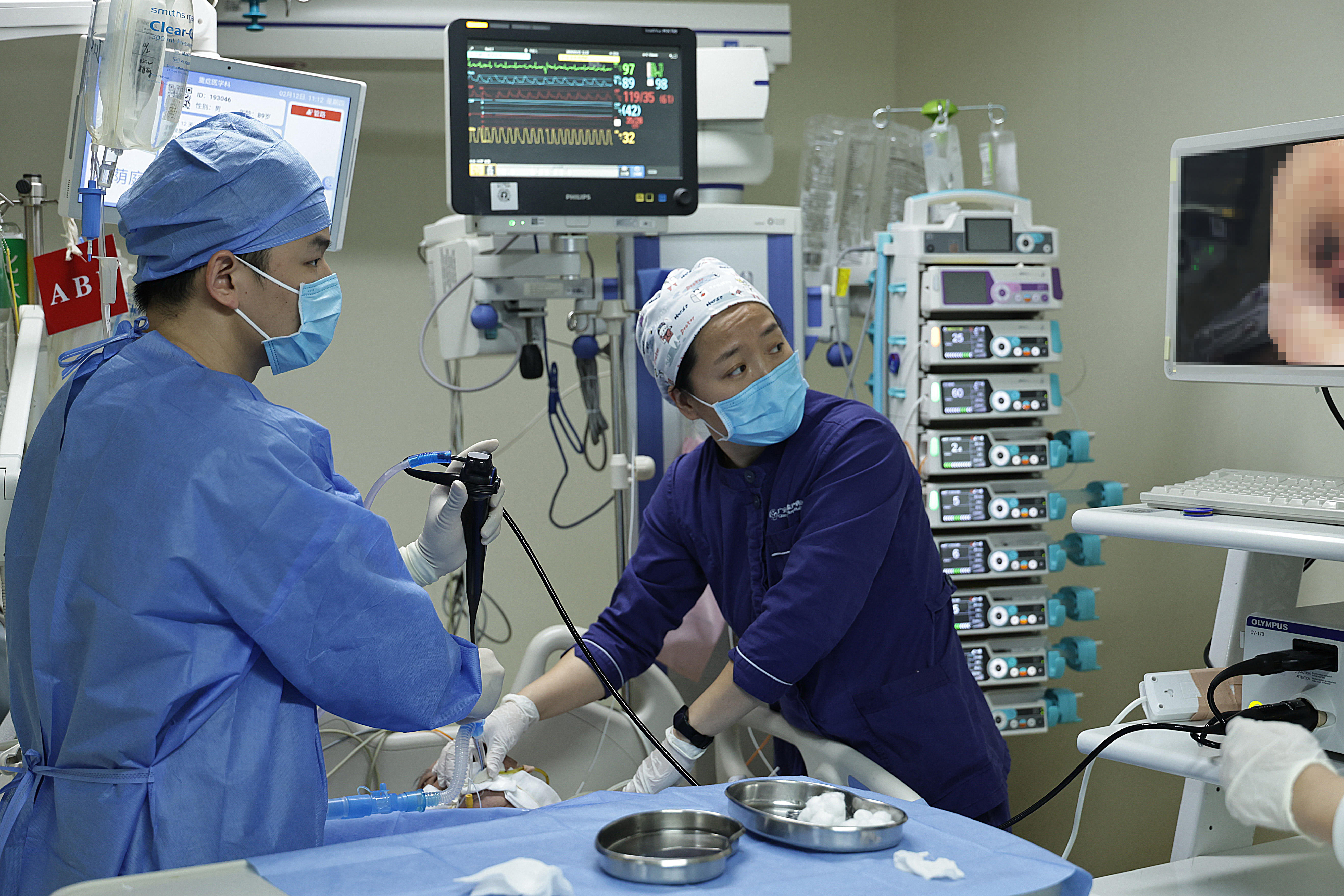 2月12日11时许,医护东谈主员在重症监护室为别称患者进行支气管镜检查。