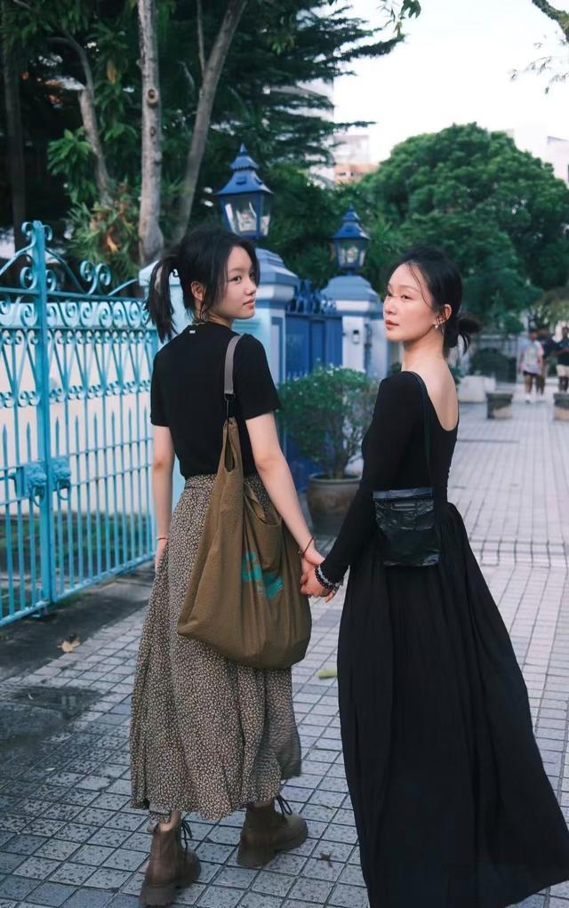 有一张是母女俩如今的合影。男儿头发简易扎了起来,身穿玄色T,搭配长裙,脚穿马丁靴;她身穿露背玄色长裙,母女俩手牵入部下手走在街上,看起来有种姐妹的既视感,看不出22岁的年纪差。