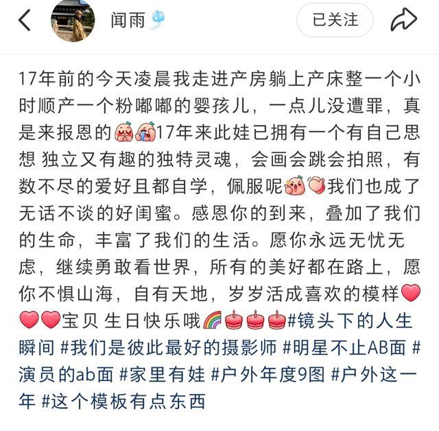 婚后,两东谈主迎来了爱情的结晶。一眨眼,两东谈主的男儿迎来了17岁寿辰。今天(2月6日),闻雨在搪塞账号为大男儿庆生。她写谈“17年前的今天凌晨我走进产房躺上产床一个小时安产一个粉嘟嘟的婴孩儿,少量儿没吃苦,真的来酬报的,17年来此娃已领有一个我方念念想、沉寂又真谛的特有灵魂,会画会跳会拍照,独特不尽的心疼且王人自学的,佩服呢。咱们也成了无话不谈的好闺蜜。感德你的到来,重叠了咱们的生命,丰富了咱们的生涯。愿你永久高枕而卧,继续勇敢看寰宇,总计的好意思好王人在路上,开云体育下载愿你不惧山海,自有寰宇,岁岁活成可爱的边幅。宝贝寿辰自得哦。”